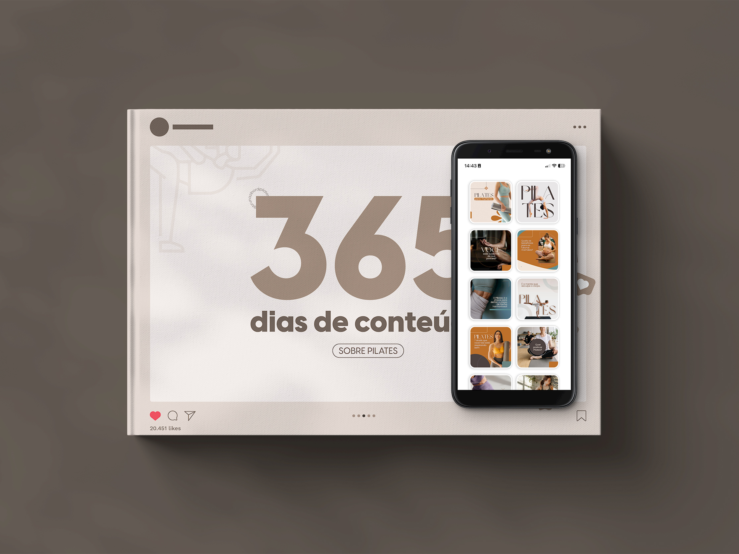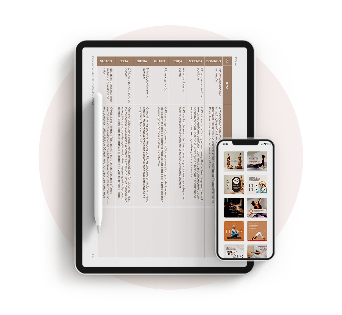 Planner Calendário Digital com 365 dias de conteúdos sobre pilates + 365 artes editáveis Canva. Produza seus conteúdos em um estalar de dedos e nunca mais fique travada na hora de criar seus posts!